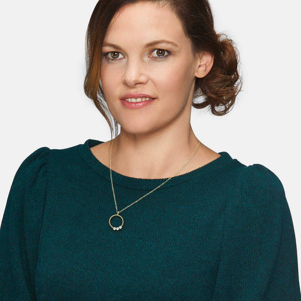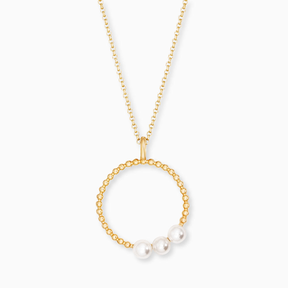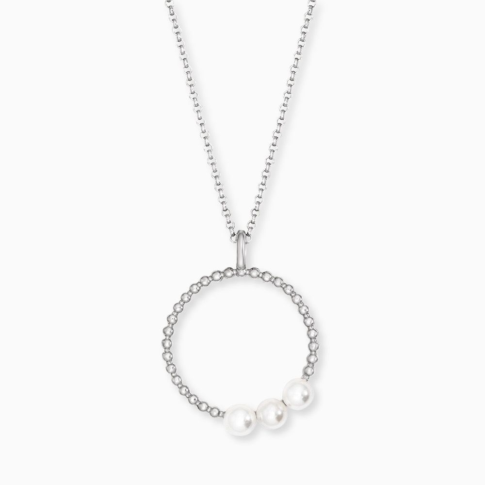 Pearls – Spherical Nobility. Our round pearls are echoed throughout the design of the pendant. The pearl radiates pure beauty and femininity, and its shimmering white surface soothes the soul. The chain, wrapped in classic silver, exudes elegance and refinement. This timeless piece is secured with a lobster clasp and adjustable to three different lengths.