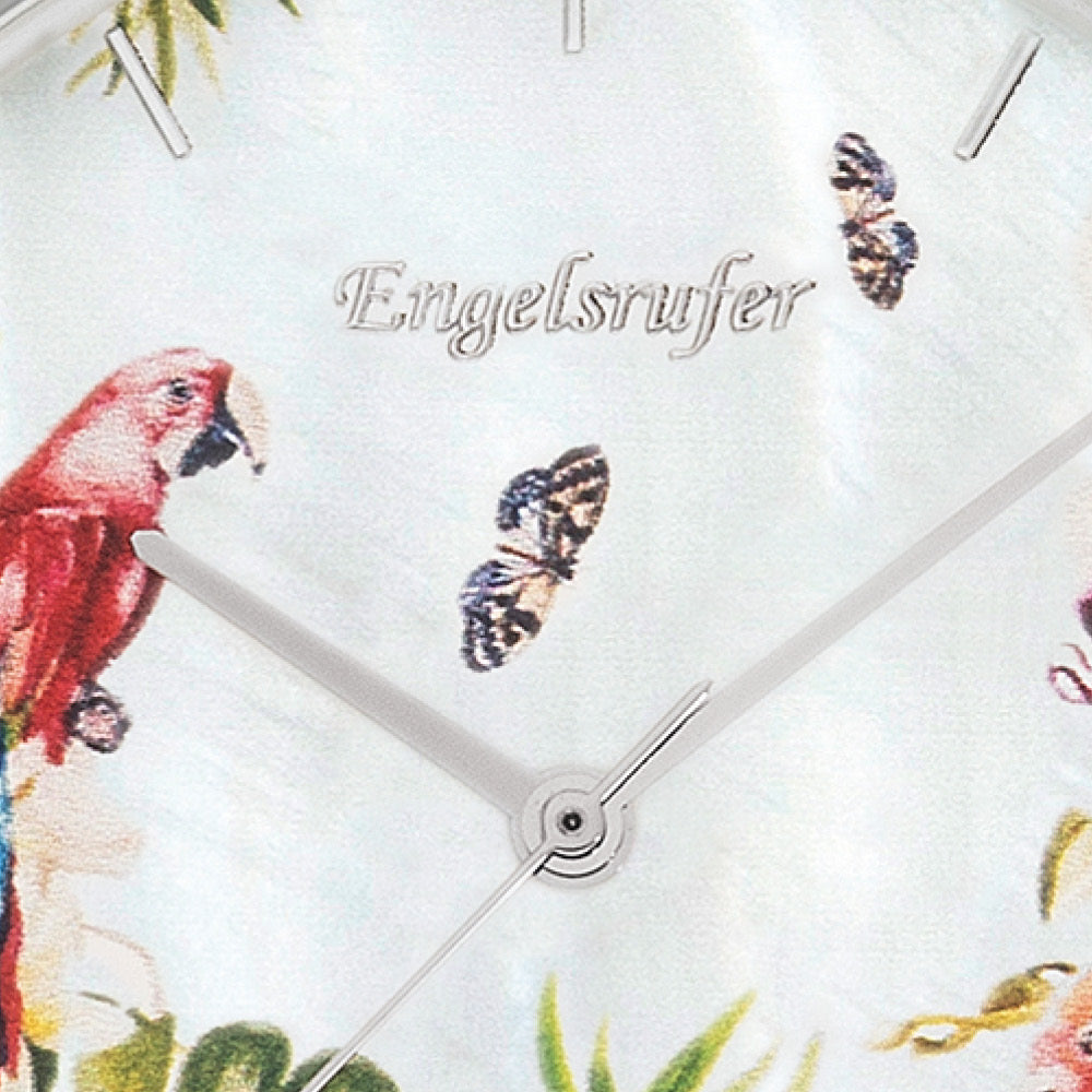 Paradise – a paradisiacal variety of colors brings a touch of nature to your home. This timeless combination enchants with a flat case, 3-hand movement and a watch strap made of high-quality, genuine Italian nubuck leather. The band is individually adjustable and can be set to a minimum of 16 cm and a maximum of 21 cm circumference. The fine, natural and colorful accents of the dial on a delicately shiny mother-of-pearl make this watch a stylish evergreen. The special highlight is our colorful flower paradise with a parrot. Our recommendation: Thanks to the quick-release system, all straps on our Engelsrufer watches can be easily removed from the case and replaced using the pressure of your finger. In no time at all, the right Engelsrufer watch strap can be combined to match the mood of the day or any of your outfits. In addition, all Engelsrufer watches can be individually engraved on the back of the case. Engraving makes it your personal unique item. All Engelsrufer watches are made of high-quality stainless steel, nickel-free and therefore ideal for allergy sufferers.