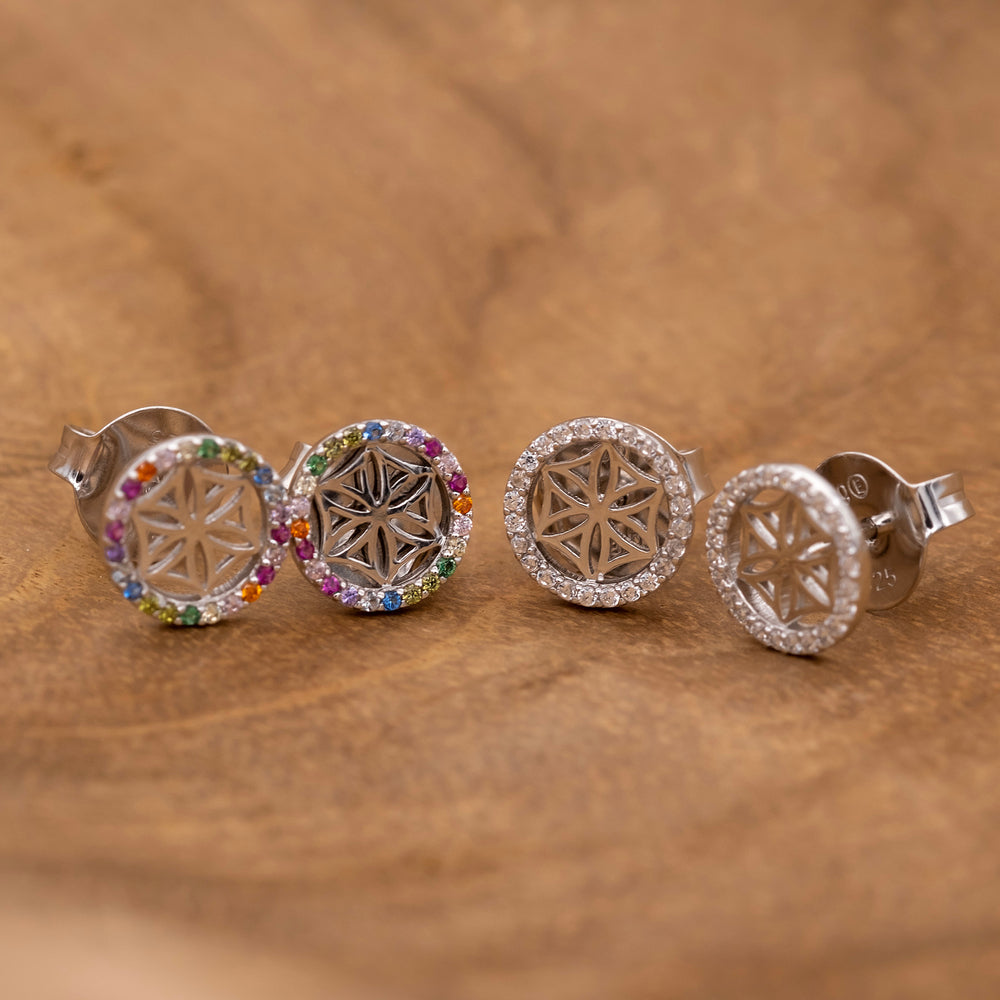 Flower of Life - these delicate ear studs are a great eye-catcher and impress with their powerful design language. The flower of life has long symbolized harmony and balance and is a sign of calm, strength and joy of life at the same time. A special highlight are the elegantly shimmering synthetic zirconia stones. Because what could be more feminine than radiantly beautiful crystals surrounded by classic silver. The stud earrings can be perfectly combined with a variety of our pieces of jewelry.