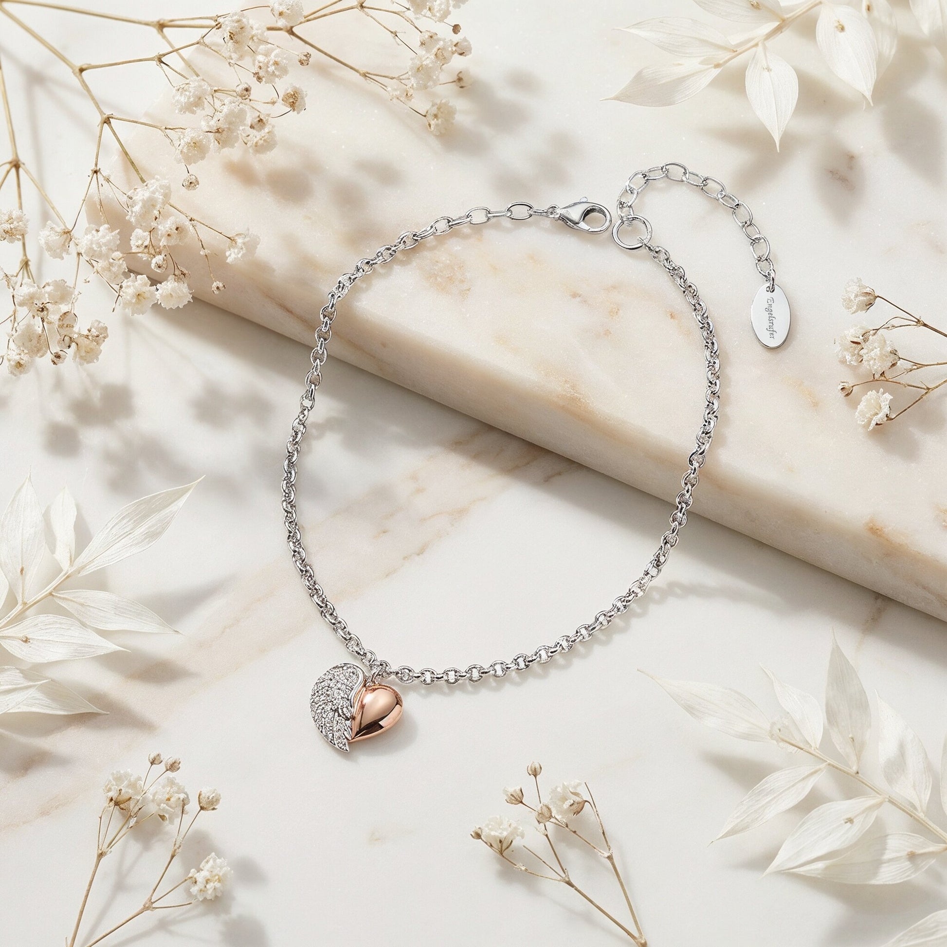 With Love - diese zuckersüße Herzflügel Fußkette in Bicolor ist für einen ganz besonderen Menschen gedacht und verleiht Eleganz, wunderschöne Weiblichkeit und strahlende Jugend. Das ausdrucksstarke Bicolor besticht in zart schimmernden Pastelltönen und wirkt besonders sanft. Der schützende Flügel soll Dir Türen im Leben öffnen, das Herz schenkt Dir Liebe. Das Schmuckstück überzeugt dabei durch die Vielzahl an kleinen Details und ist ideal mit weiteren Schmuckstücken kombinierbar. Die Fußkette wird mit einem Karabinerhaken verschlossen und ist in diversen Längen verstellbar.