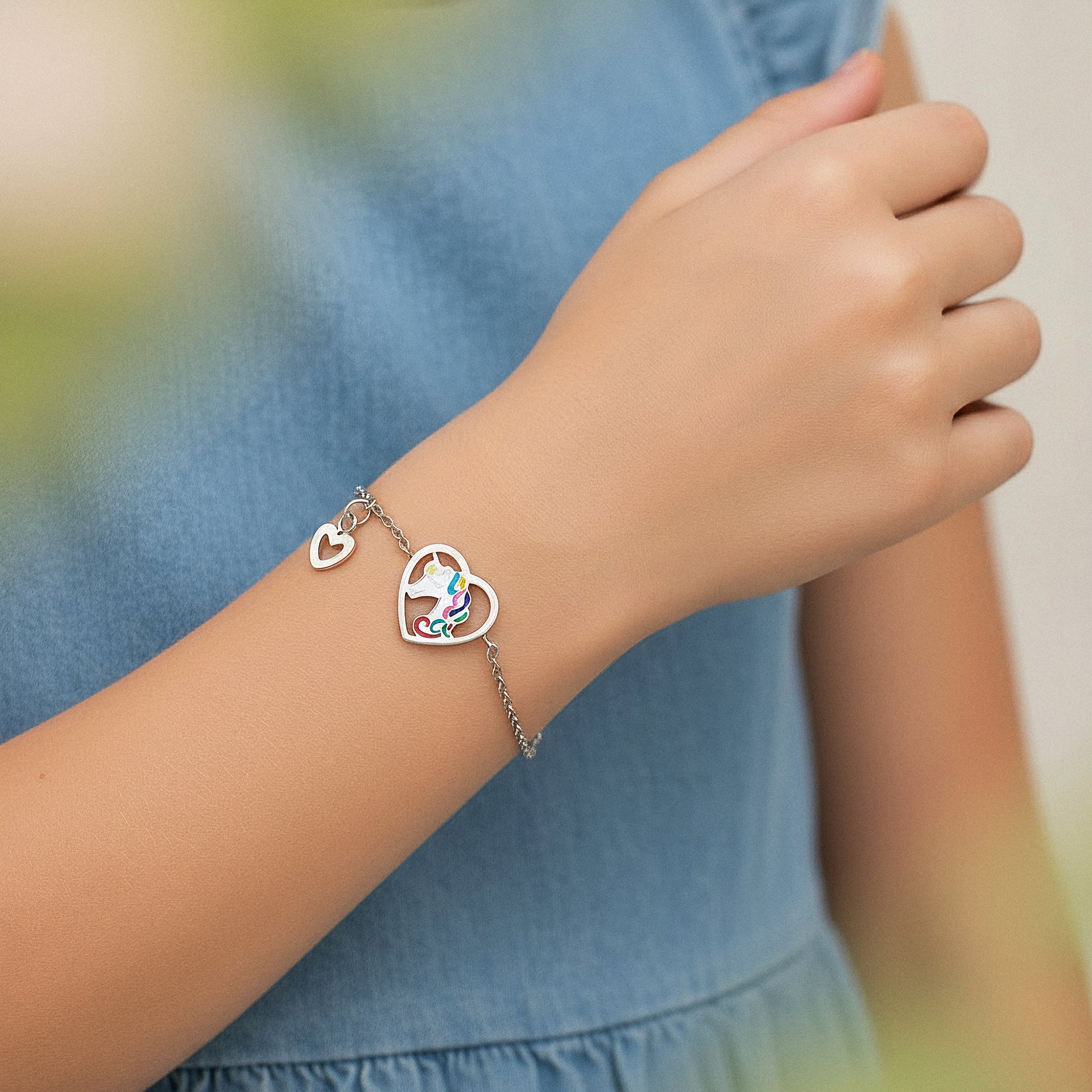 - Hochwertiges Armband aus Edelstahl, IP-Rhodium mit Emaille verziertem Einhorn