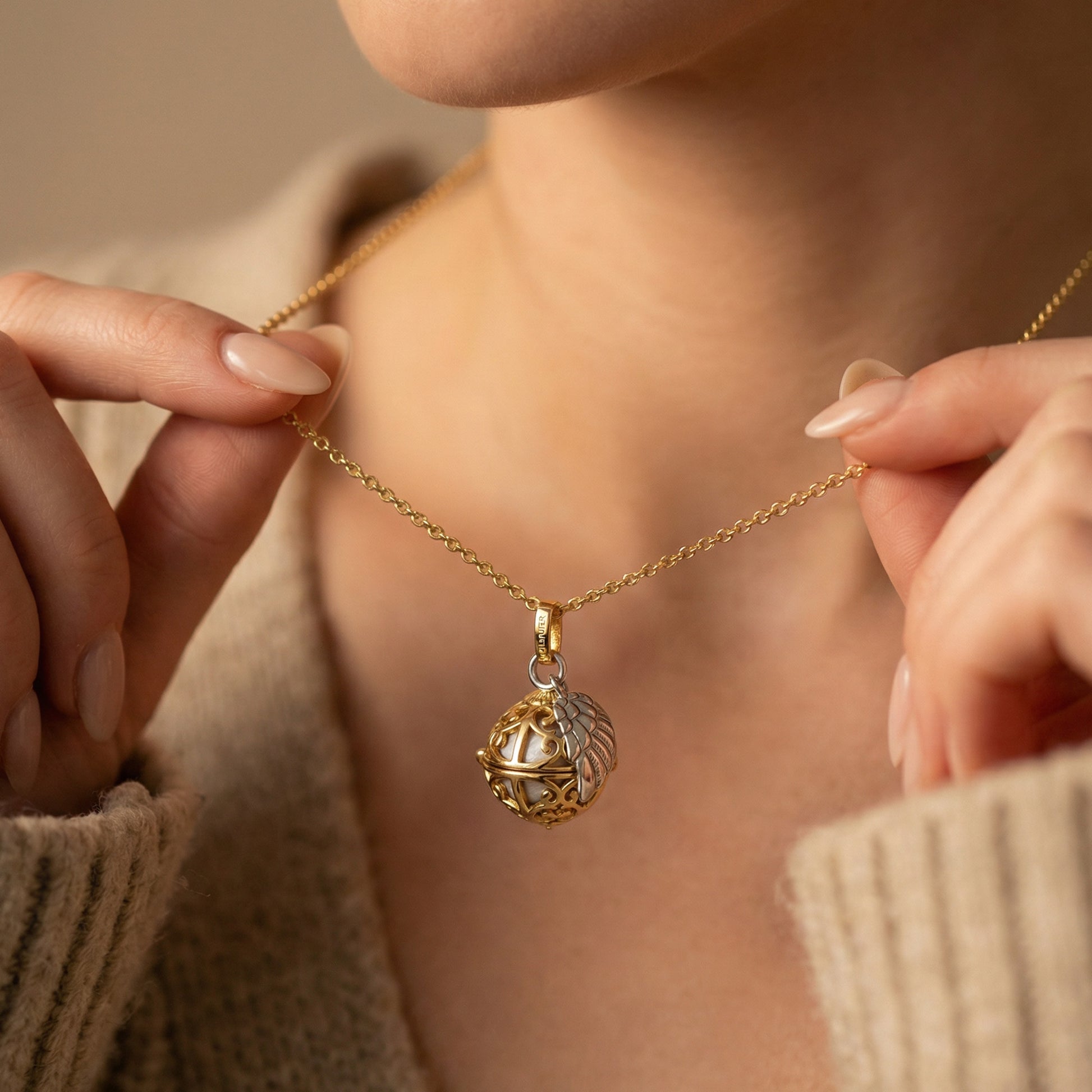 Erlebe das zauberhafte Gefühl der Sicherheit durch einen Schutzengel mit unserer eleganten und zeitlosen Engelsrufer-Halskette mit Anhänger und einem dazu passenden Engelsflügel. Jedes kleine liebevolle Detail wurde sorgfältig von Hand gefertigt, um Dich zu verzaubern und Deinen Engel zu rufen. Durch das zarte Muster des handgefertigten Körbchens wird die inliegende Klangkugel perfekt in Szene gesetzt. Diese kann einfach ausgetauscht werden, um jedem Outfit einen neuen Look zu verleihen.
