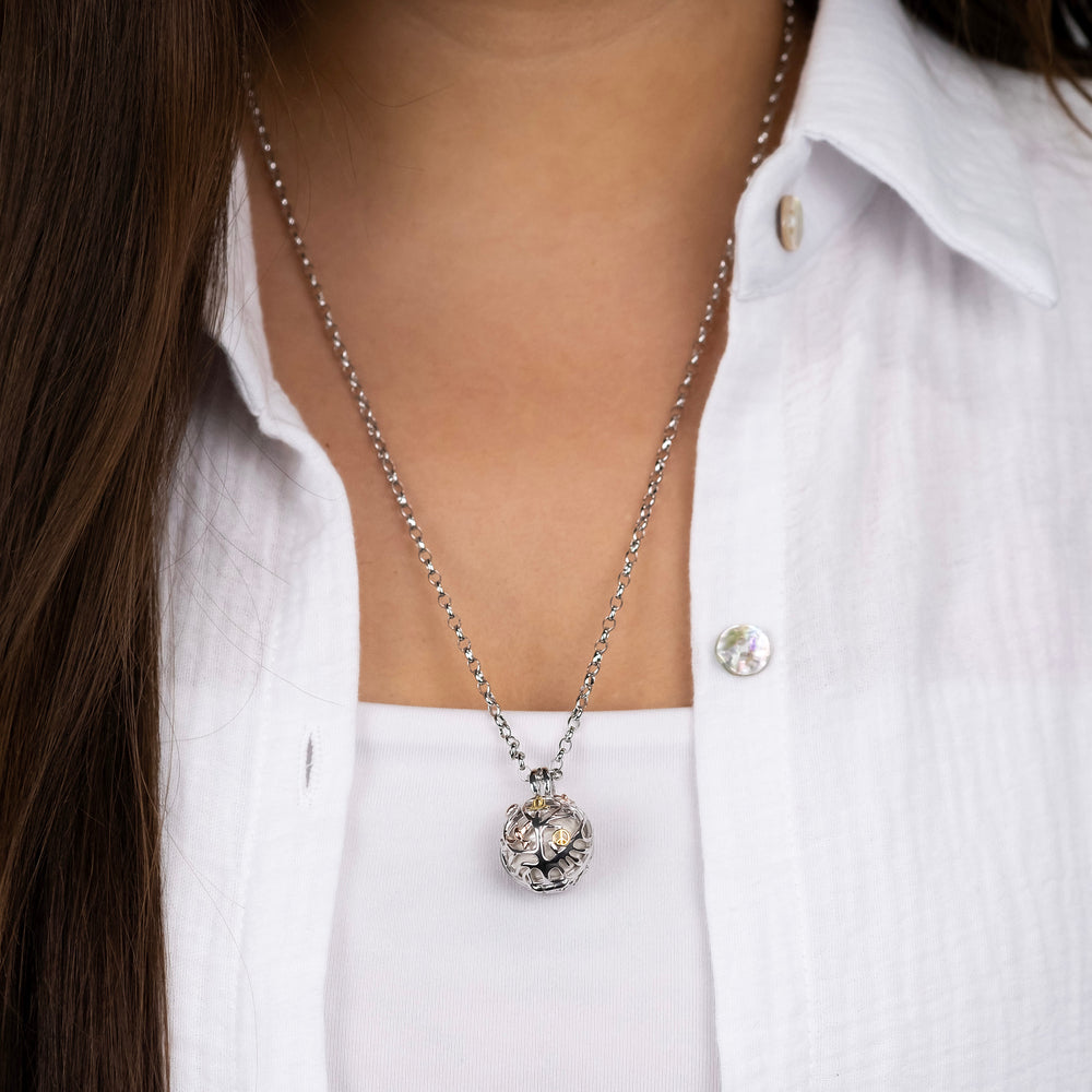 Der traumhafte Paradise Tree in Tricolor verzaubert Dich durch die Vielzahl seiner kleinen liebevollen Details. Der fein ausgearbeitete Lebensbaum mit seinen Motiven wie Herz, Buddha, Elefant und Taube schenken Dir unendliche Harmonie, Stärke und Lebensfreude. Das ausdrucksstarke Tricolor besticht in zart schimmernden Pastelltönen und wirkt besonders sanft. Durch das zarte Muster des Anhängers wird die innliegende farbige Klangkugel perfekt in Szene gesetzt. Öffne das handgefertigte Körbchen und befülle es mit Deiner Lieblings-Klangkugel. Durch die Vielzahl an Variationsmöglichkeiten erhältst Du dadurch jeden Tag einen neuen Look. Mit seinem zarten Klang ruft er Deinen ganz persönlichen Schutzengel zu Dir und sorgt für Harmonie und Ausgeglichenheit.